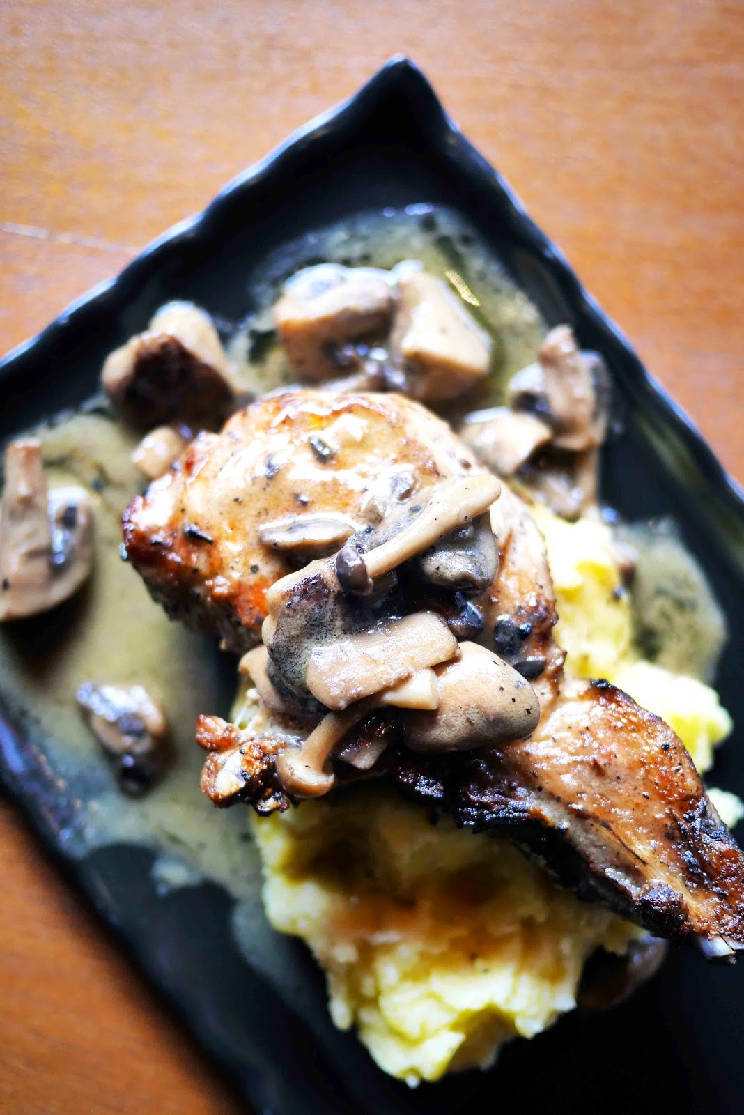 Grilled mustard marinated 220gr pork chop with mix mushroom.