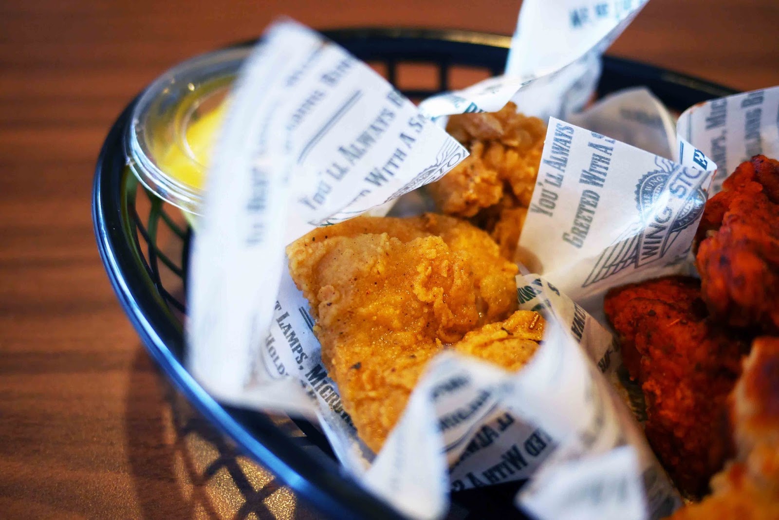 Like I said before, you can clearly see the size difference! Yet this is pretty tempting, since you don't need to get down and dirty and pretty easy to eat but where's the fun in that, right? :p Oh, almost forgot to tell you that either this and the crunchy wings menu comes with a dipping sauce! You can either choose honey mustard or creamy ranch! There's also a cheddar cheese sauce but because the price is different, it's not included in the complimentary choice! :(